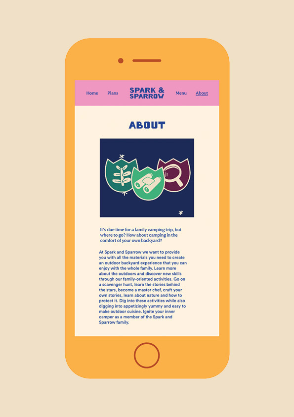 Spark & Sparrow is a family-oriented meal kit aimed at creating an outdoor backyard camping experience. Each kit includes a meal, dessert, drinks, patches with activities, and any necessary tools you may need for cooking. We want to bring families together to not only experience the outdoors in a new way but to help them learn while doing it. Check out the full case study here.