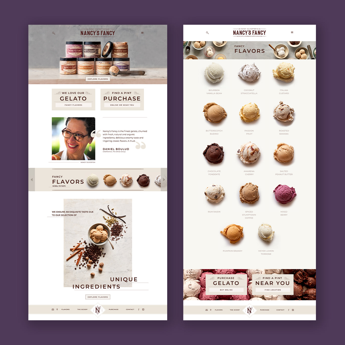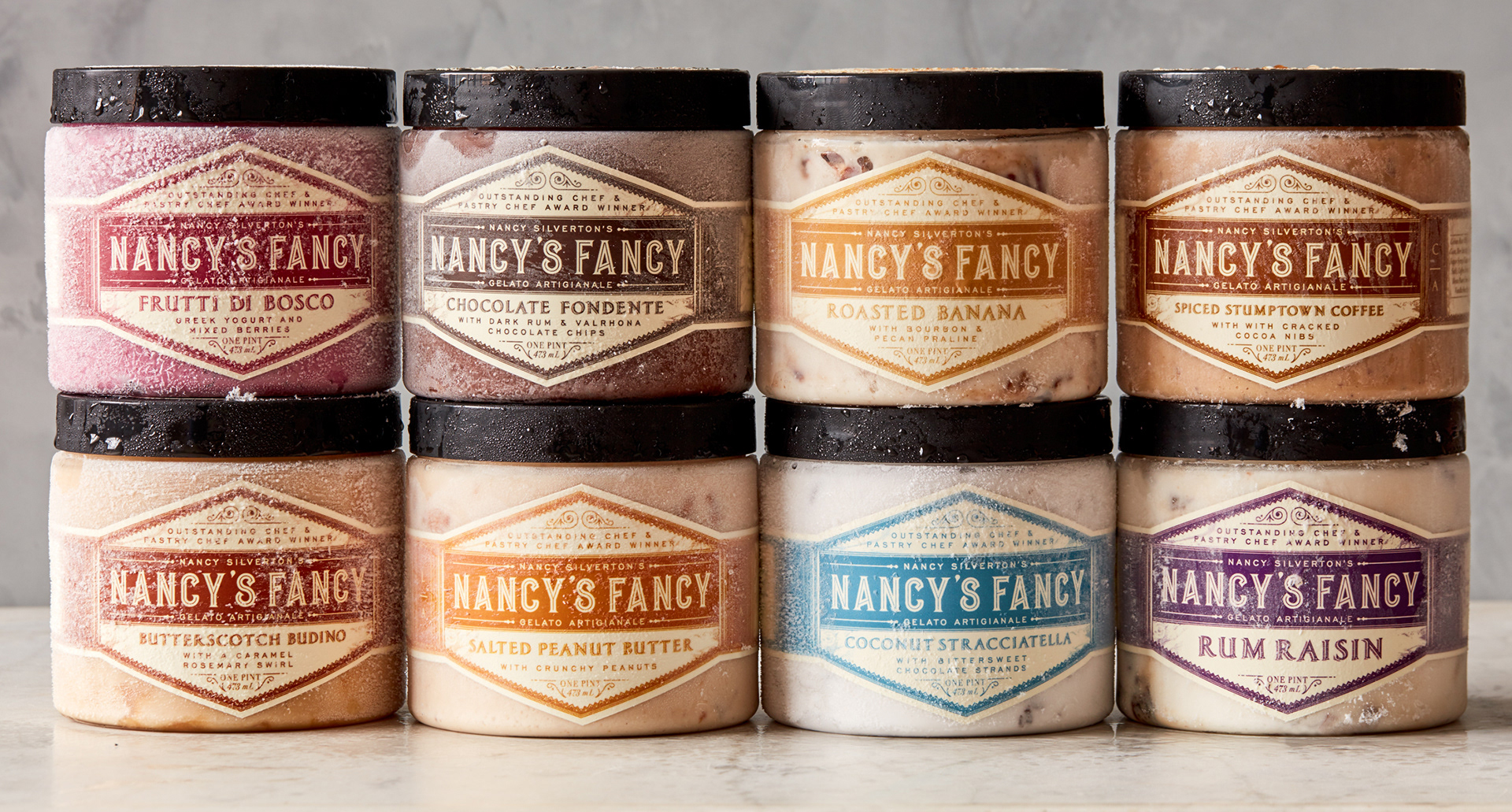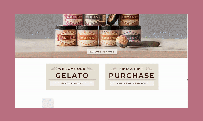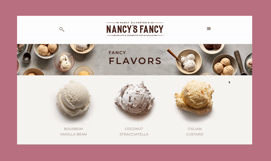 Created for Nancy Silverton, a James Beard award-winning chef, the team at Nancy's Fancy Gelato and Sorbetto approached us to update their branding to have a more artisanal feel. The final branding was inspired by Italian packaging, a unique color expresses each flavor to ease the ability to quickly find your favorite flavor. The unusual label shape allows for the product to shine through, and the website showcases the ingredients that make each flavor special. Italy also inspires the trade show booth, this time looking at Italian farmhouses and featuring the flavor scoops through an old paneled window.